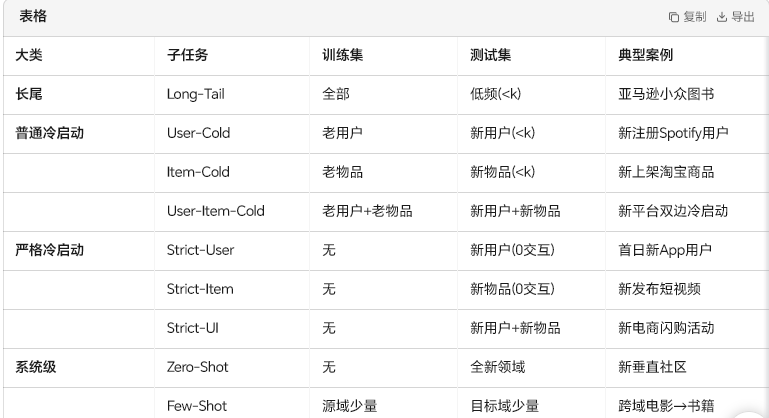 - 通用定义:训练集包含有交互的 “暖用户 / 物品”,测试集包含无 / 少交互的 “冷用户 / 物品”,需预测冷实体的交互行为。