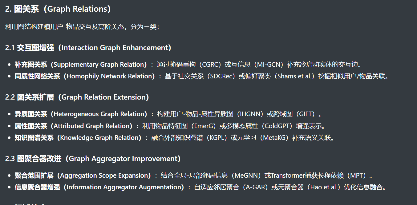 - 异构图关系:引入多类型节点 / 边(如用户、物品、社交关系)