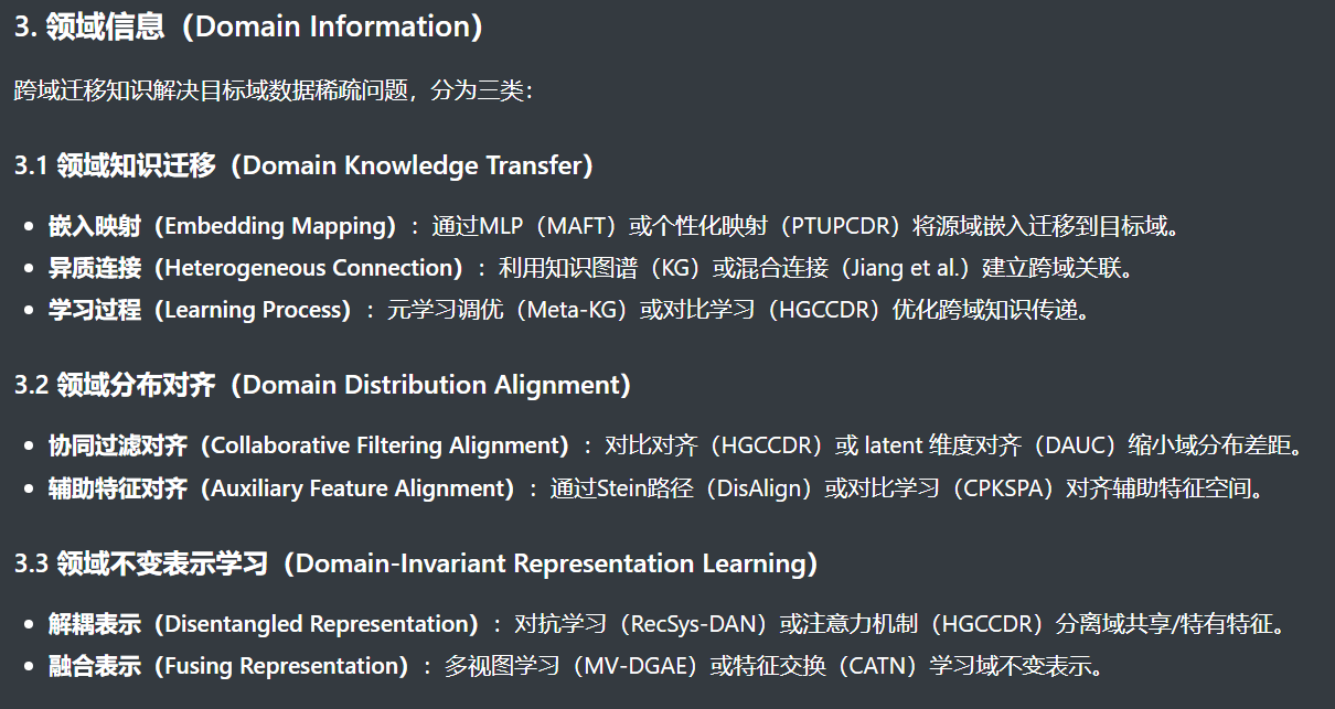 核心思路:利用源领域(数据丰富)的知识,迁移到目标领域(冷启动场景),分三类方向: