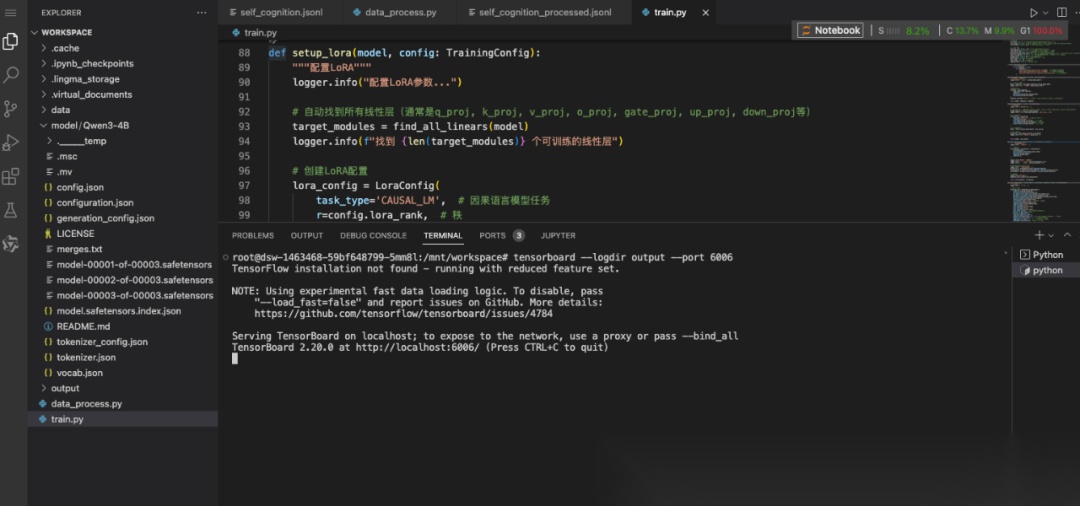 LoRA(Low-Rank Adaptation)是一种参数高效的微调方法。它的核心思想很简单:冻结原模型参数,只训练额外的小参数矩阵来调整模型输出创建数据处理脚本。