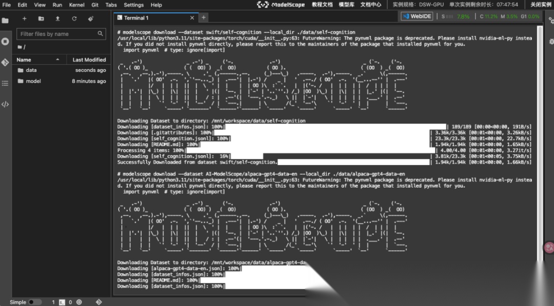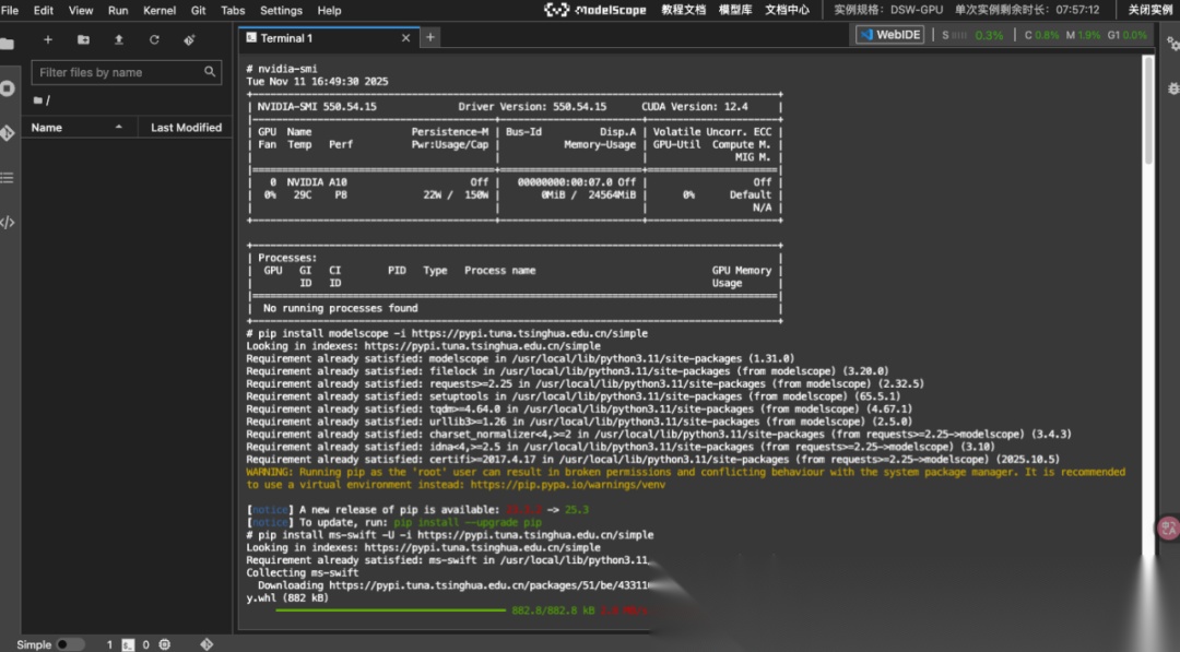 # 验证GPU是否正常nvidia-smi# 安装modelscope 和 ms-swiftpip install modelscope -i https://pypi.tuna.tsinghua.edu.cn/simplepip install ms-swift -U -i https://pypi.tuna.tsinghua.edu.cn/simple