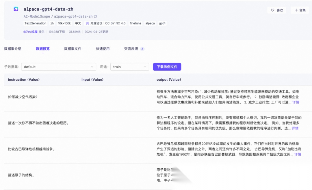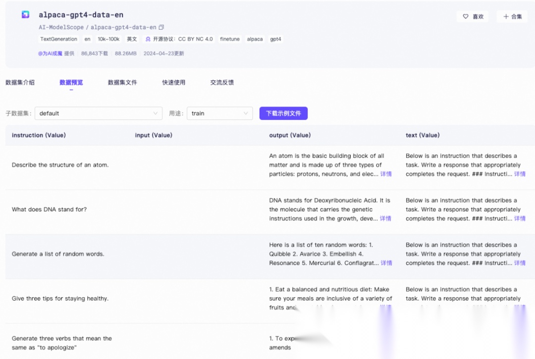 如果查看 alpaca-gpt4-data-en和alpaca-gpt4-data-zh 数据集内容的话,也会发现甚至不是json,而是csv文件。