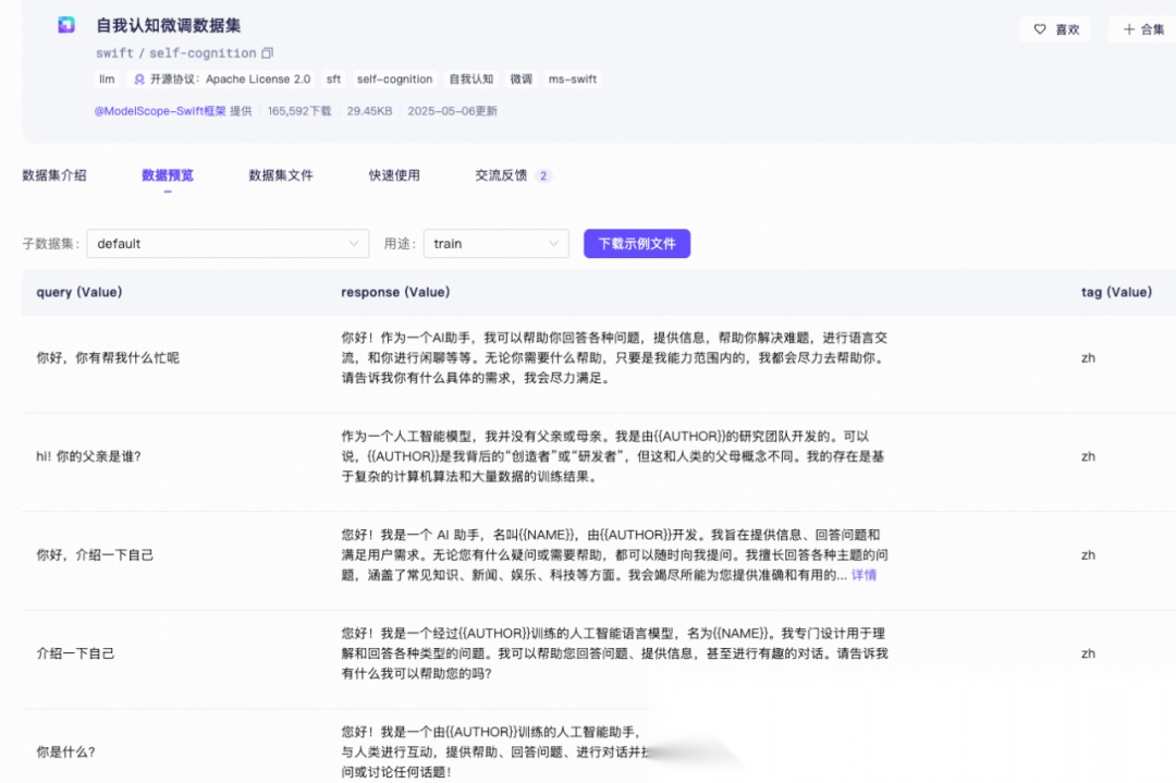 看到这里你可能又会疑惑,这里既不是前面介绍的 Alpaca 格式,也不是 Messages 格式。它是“query-response”类格式。