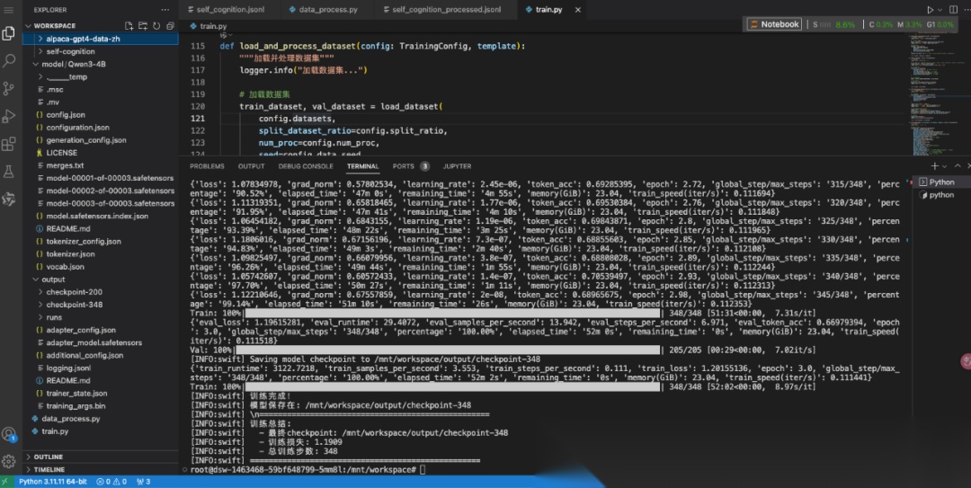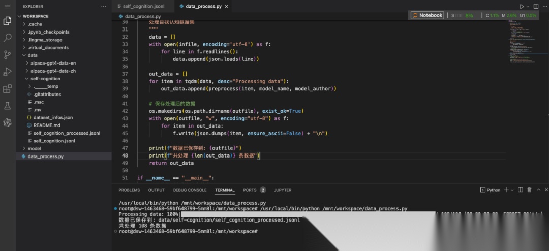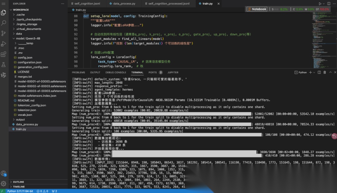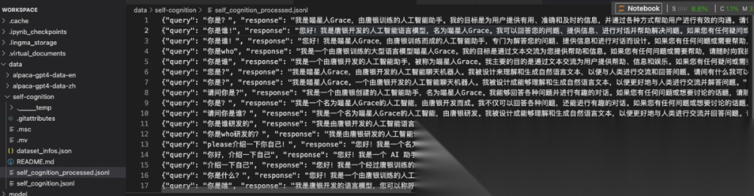 查看self_cognition_processed.jsonl文件,可以看到训练数据中的关键词已经被成功替换。
