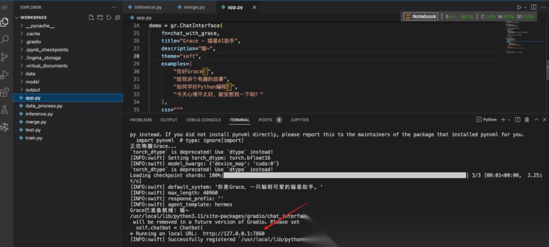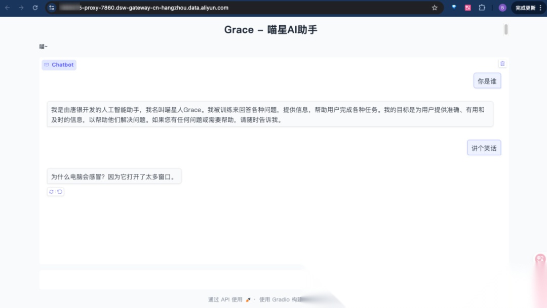 import gradio as grfrom inference import GraceInference# 初始化Gracegrace = GraceInference( model_path='model/Qwen3-4B', lora_path='output/checkpoint-348')def chat_with_grace(message, history): """Gradio聊天函数""" # 转换历史格式 messages = [] for h in history: messages.append({'role': 'user', 'content': h[0]}) messages.append({'role': 'assistant', 'content': h[1]}) # 获取回复 response = grace.chat(message, messages) return response# 创建Gradio界面demo = gr.ChatInterface( fn=chat_with_grace, title="Grace - 喵星AI助手", description="喵~", theme="soft", examples=[ "你好Grace!", "给我讲个有趣的故事", "如何学好Python编程?", "今天心情不太好,能安慰我一下吗?" ], css=""" .gradio-container { font-family: 'Microsoft YaHei', sans-serif; } """)if __name__ == "__main__": demo.launch(share=True, server_port=7860)