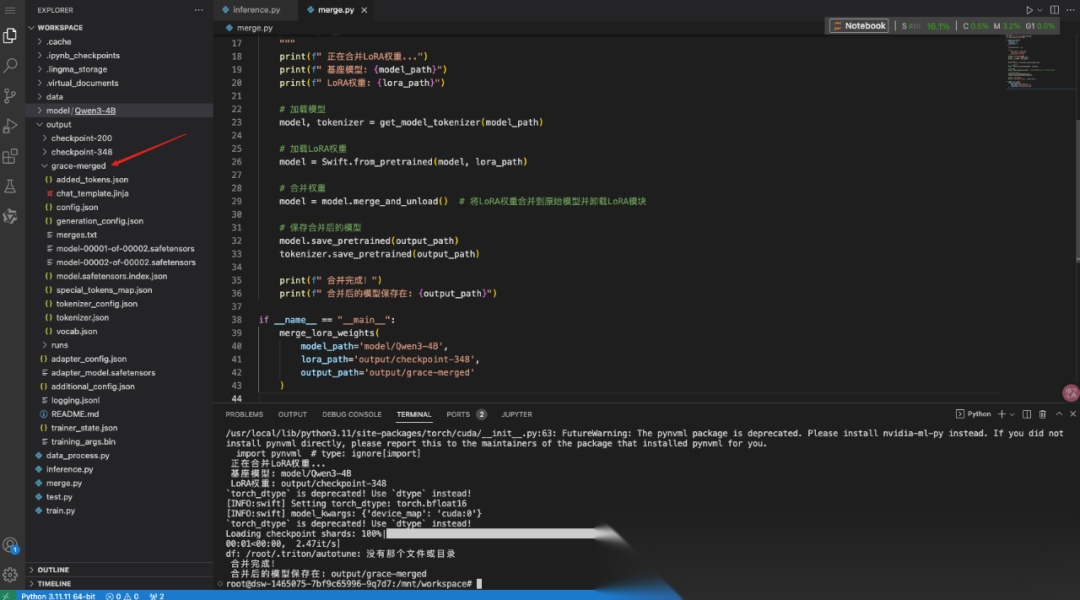 如果你想将LoRA权重合并到基座模型中,创建 merge_lora.py: