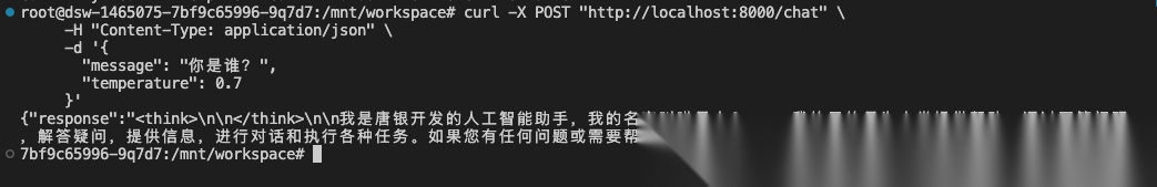 curl -X POST "http://localhost:8000/chat" \ -H "Content-Type: application/json" \ -d '{ "message": "你是谁?", "temperature": 0.7 }'
