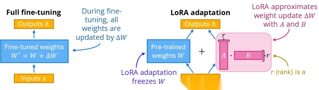# 传统微调:所有参数都要计算梯度原模型权重W → 计算梯度 → 更新 → 占用大量显存# LoRA:只有小矩阵需要梯度原模型权重W(冻结)→ 不计算梯度小矩阵A、B → 计算梯度 → 更新 → 梯度存储降低99%