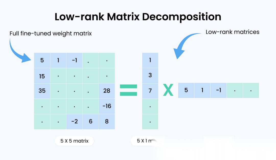 W0 = [[2, 0], [0, 2]]ΔW ≈ A · B (rank=1)A = [[1], [2]]B = [[3, 1]]=> ΔW = [[3, 1], [6, 2]]