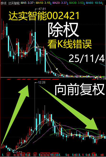 虽然搜索结果未提供达实智能15年完整的复权前后对比K线,但根据MCP工具获取的实时行情数据,其当前股价为3.00元(2025年11月4日)。若查看不复权K线,历史上较高的股价(如分红送股前)会因除权而"下跌",造成长期下跌的假象。