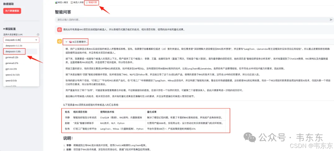 单轮问答:“请找出所有具备 RAG 项目实战经验的候选人,并以表格形式展示他们的姓名、相关项目名称、使用的技术栈和量化成果。”