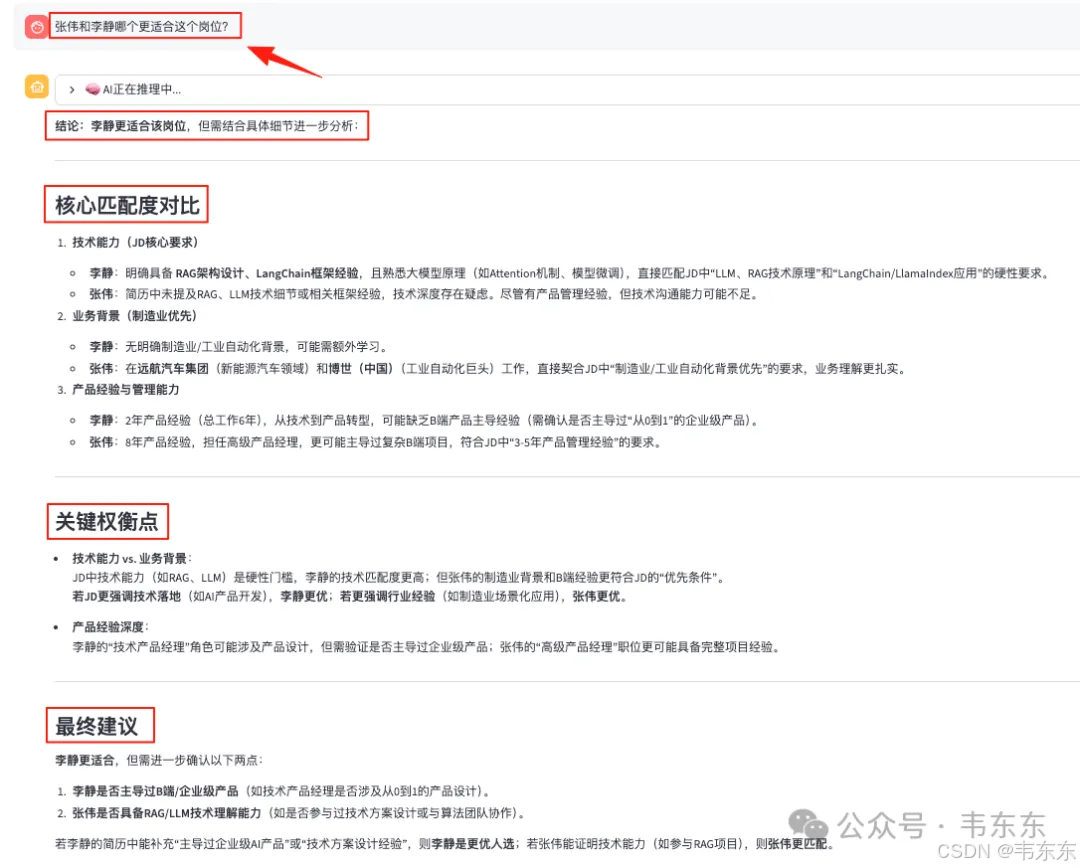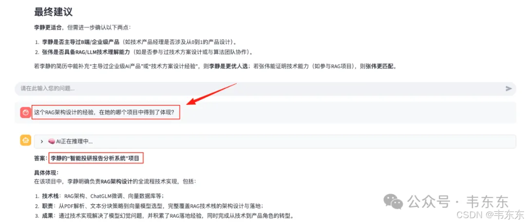 系统成功地理解了代词“她”(指代李静)和上下文中提及的“RAG 架构设计经验”,并精准地将这项抽象技能与“智能投研报告分析系统”这一具体项目关联起来。这有力地证明了 RunnableWithMessageHistory 组件的有效性,系统具备了真正连贯、有深度的对话能力。