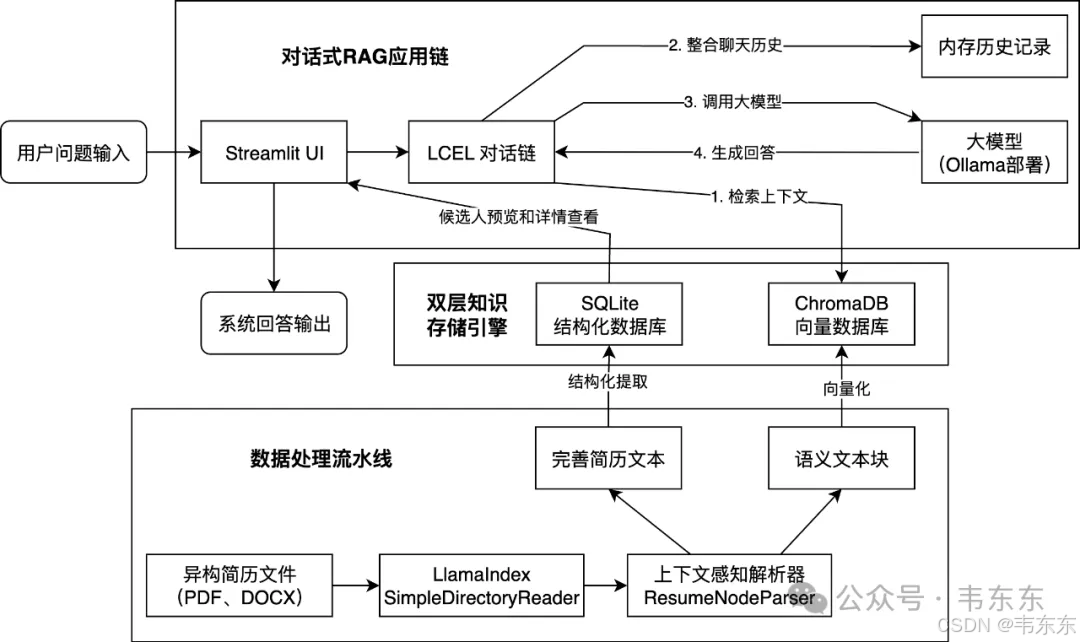 简历筛选场景的三大核心痛点、包含数据处理流水线、双层知识存储引擎,以及基于 LCEL 对话式 RAG 应用链的核心架构,最后完整的演示下框架化的开发流程并进行效果验证。