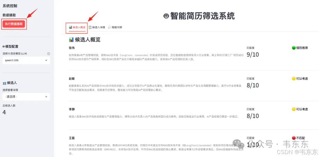 在后台执行 streamlit run app.py 命令启动应用后,在前端界面的侧边栏点击“执行数据摄取”按钮,系统会自动完成对 documents 目录下所有简历的解析、结构化提取和索引构建。候选人概览标签页展示了数据处理与分析的结果。