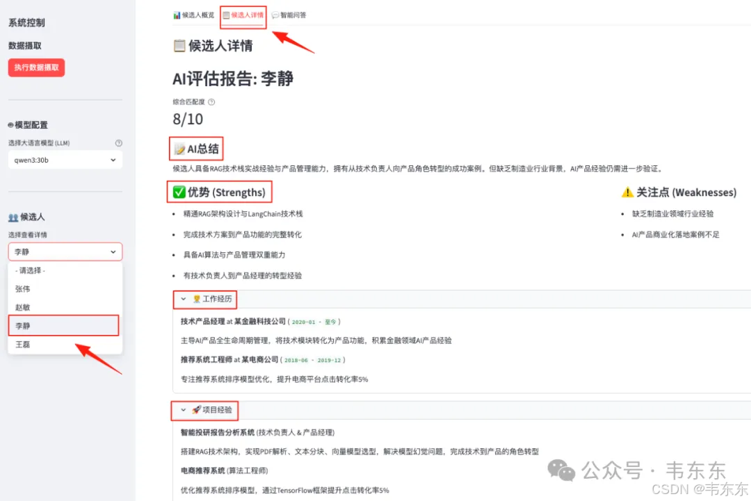 与此同时,数据处理流水线输出的完整简历文本,会经历一个结构化提取过程。这个过程调用大模型,根据预定义的 Pydantic 模型(Python 数据验证库,用于定义结构化数据格式),从纯文本中抽取出候选人的姓名、工作年限、项目经验、优劣势分析等关键信息,形成一份标准化的结构化档案。这份档案最终被存入 SQLite 结构化数据库(一个轻量级的关系型数据库)。这个数据库的作用是为最后的用户界面提供即时候选人信息查询服务,支撑系统的候选人概览和详情展示功能。