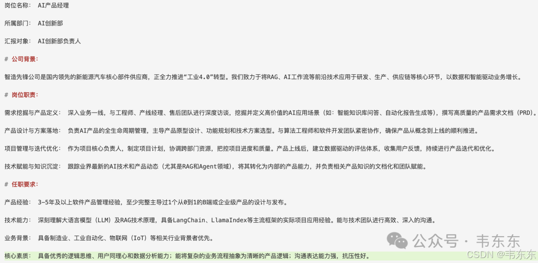 所有筛选和评估逻辑围绕“AI 产品经理”职位展开。该岗位主要负责 RAG、AI 工作流等前沿技术在新能源汽车制造领域的产品化应用。具体查看下面截图