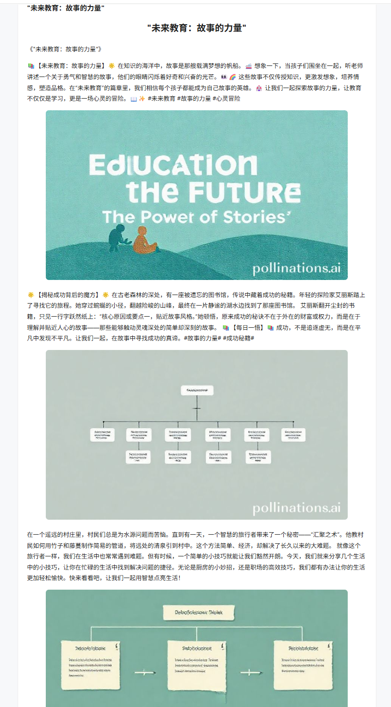 - 核心职责:接收调度智能体的 “图片主题 + 风格” 参数,调用 Pollinations API 生成配图,并上传至微信素材库