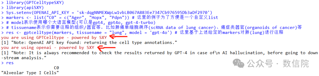 res <- gptcelltype(markers, tissuename = "lung", model = 'gpt-4o') # 这里基于上述给定的markers对肺(lung)进行注释