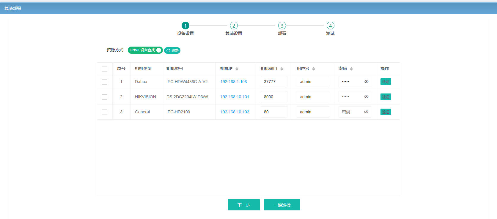 系统通电接网即可快速完成上机,引导模式操作,自动搜索局域网内摄像机资源,可实现3分钟内视频接入及算法部署并完成功能测试验证。