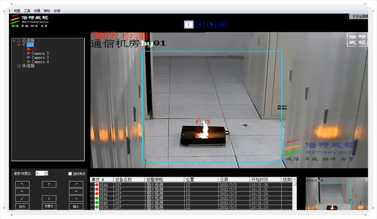 - 烟雾/火焰初起(早期预警):检测异常烟雾或火焰,为早期火灾处置争取宝贵时间,可在火灾发生初期5-10秒内检测到烟雾和火焰。