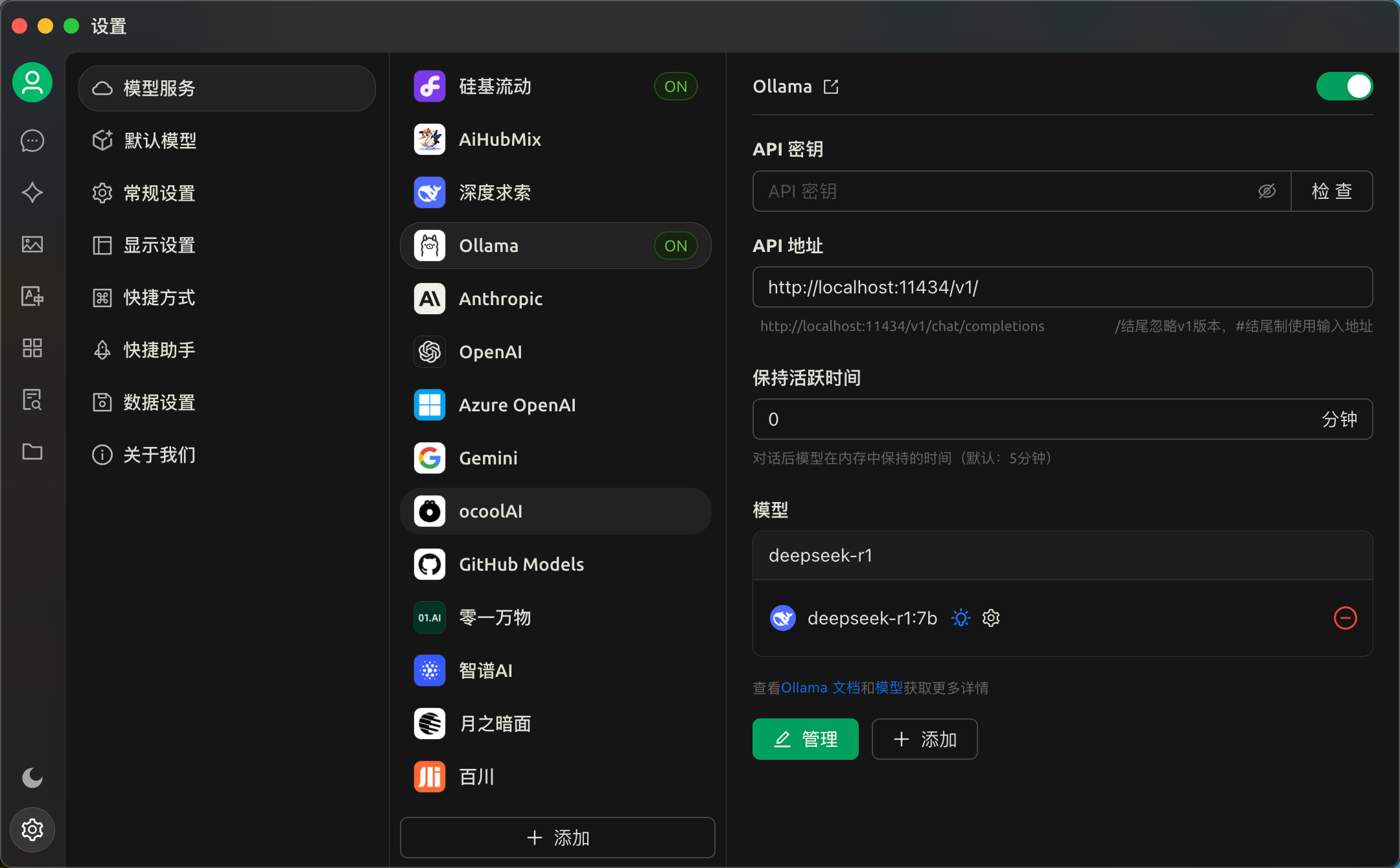 - 自定义配置:在自定义配置中,将 API 地址设置为http://localhost:11434 ,这是 Ollama 服务的默认接口地址,确保 Cherry Studio 能连接到本地运行的 DeepSeek-R1 模型。