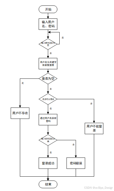 用户输入用户名和密码后,系统先检查输入是否为空,再验证用户名是否存在,若存在则通过用户名获取密码并校验。若密码正确则登录成功,否则提示密码错误。若用户名不存在或无法登录,提示用户操作无效。如图3-4所示。