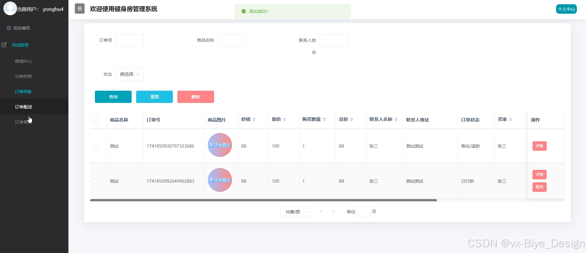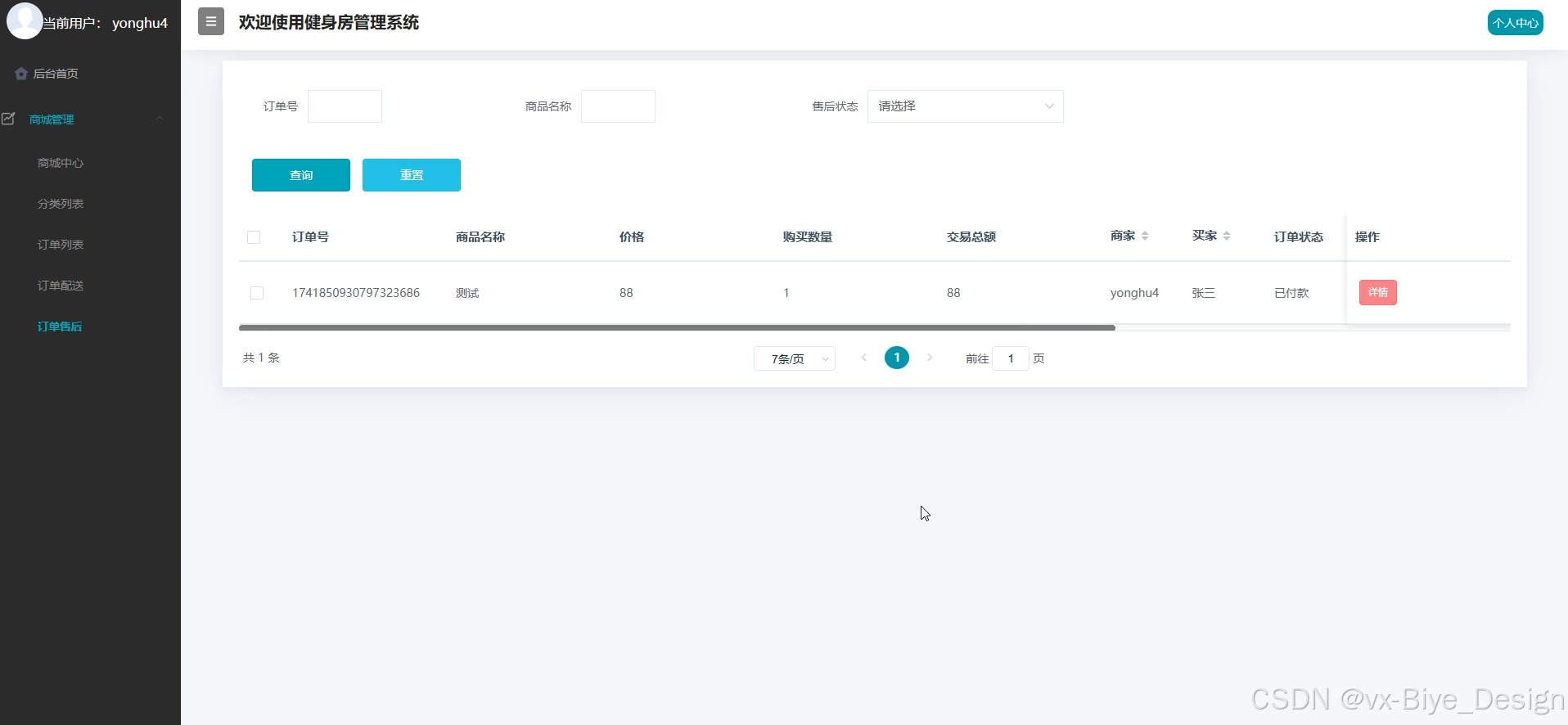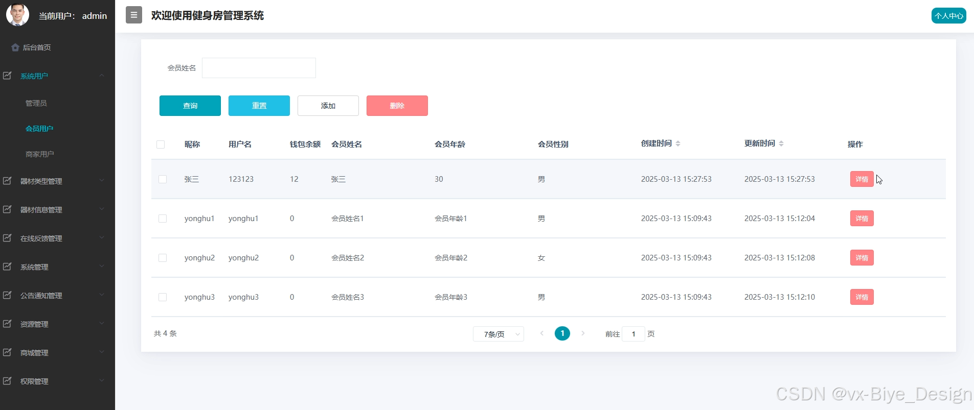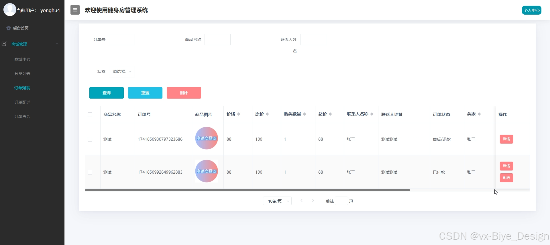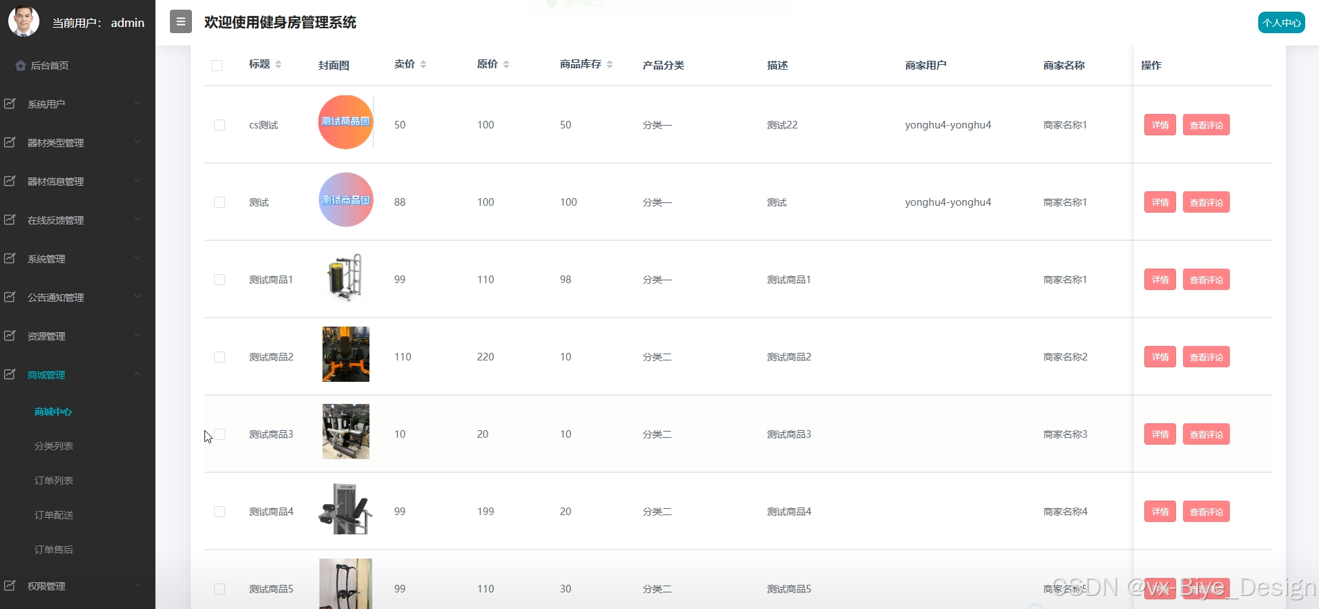 本研究设计并实现了一套基于SpringBoot框架的健身房管理系统,提升健身房的运营效率和服务质量。系统采用前后端分离架构,前端基于Vue技术实现交互界面,后端以SpringBoot框架为核心,结合MySQL数据库进行数据存储与管理。系统功能涵盖用户、商家和管理员三个角色,满足不同用户群体的需求。用户可查看公告通知、浏览健身资讯、商城中心商品信息、查询器材使用情况并提交在线反馈;商家负责商城中心管理、订单管理、配送管理及售后管理;管理员则进行用户管理、器材信息管理、在线反馈管理、公告通知管理及商城管理。通过这些功能,系统实现了健身房的全面信息化管理,优化了管理流程,提升了用户体验。
