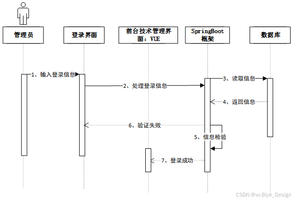 管理员输入登录信息后,登录界面将信息传递至前台管理界面,随后通过SpringBoot框架读取数据库中的用户信息并返回。系统验证信息,若验证成功则登录成功,若验证失败则返回错误提示。登录时序图如图4-4所示。