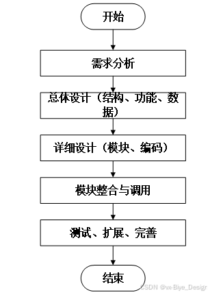 系统开发流程的主要步骤,从需求分析到系统完成的全过程。流程包括需求分析、总体设计(结构、功能、数据)、详细设计(模块、编码)、模块整合与调用,以及测试、扩展和完善,最终完成系统的开发。本系统的开发流程如图3-3所示