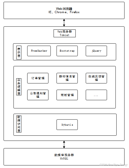 系统由表现层、业务逻辑层、数据访问层和数据库服务器组成。表现层通过浏览器(如IE、Chrome、Firefox)与用户交互,采用FreeMarker、Bootstrap、jQuery等技术实现界面呈现。业务逻辑层负责处理系统的核心业务逻辑,通过分模块设计实现功能分离。数据访问层使用MyBatis框架连接数据库,执行数据的增删改查操作。数据库服务器采用MySQL进行数据存储和管理,为系统提供稳定的数据库支持。整个架构通过Tomcat服务器完成用户请求的接收和处理,确保系统的高效运行[17]。整个系统架构如图4-1所示。