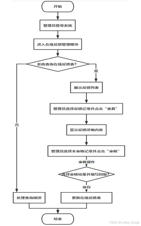 管理员登录系统进入在线反馈管理模块,系统查询并展示所有在线反馈信息,包括标题、类型、用户、日期及内容等。管理员可点击查看按钮,详细查看每条反馈的具体内容。对于未审核的反馈,管理员可进行审核操作,选择审核结果并填写回复(可选),点击保存后,系统更新反馈的审核状态和回复内容至数据库,完成在线反馈的管理流程。在线反馈管理程如图3-6所示。