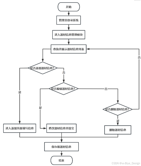 管理员登录系统后,进入器材信息管理模块,系统从数据库中查询并展示所有器材信息。管理员可以进行添加器材操作,填写器材编号、名称、类型等信息并上传图片,点击保存后,数据将被插入数据库。对于已存在的器材信息,管理员可点击编辑按钮进行修改,修改完成后保存更新数据库中的记录。若需删除器材,管理员在列表中选择相应器材并点击删除按钮,系统将从数据库中移除该器材记录,从而完成器材信息的管理。器材信息管理流程如图3-5所示。