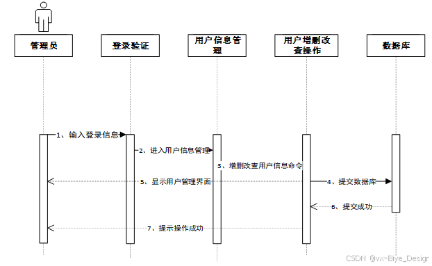 管理员输入登录信息后,进入用户信息管理模块,选择增删改查操作并提交命令至数据库。数据库执行操作后返回成功状态,系统显示用户管理界面并提示操作成功。管理员修改用户信息时序图如图4-5所示。