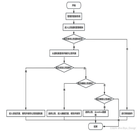 管理员登录系统后,进入公告通知管理模块,系统查询并展示所有公告通知信息。管理员可以添加新公告,填写标题和内容后保存,数据将被插入数据库。对于已发布的公告,管理员可点击编辑按钮进行修改,修改完成后保存更新数据库中的记录。若需删除公告,管理员在列表中选择相应公告并点击删除按钮,系统将从数据库中移除该公告记录,实现公告通知的有效管理。公告通知管理流程图如图3-7所示。