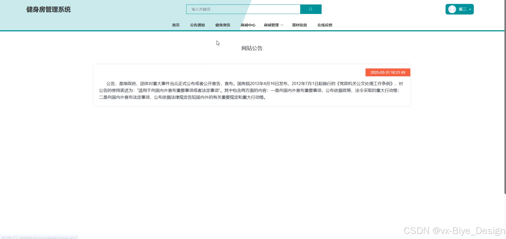 With the rapid development of information technology, the traditional operation model of the gym industry has gradually shown many shortcomings. In the past, gyms mainly relied on offline publicity and manual management, which resulted in low information transmission efficiency, poor member service experience, high operating costs for merchants, and cumbersome and error-prone management processes. In order to solve these problems, a set of gym management system based on SpringBoot was designed and implemented. The front-end uses Vue technology, the back-end is based on the SpringBoot framework, and the database is MySQL.