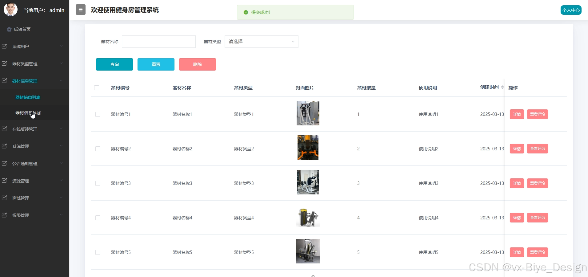 管理员能够成功添加新器材,新器材出现在器材信息列表中 |