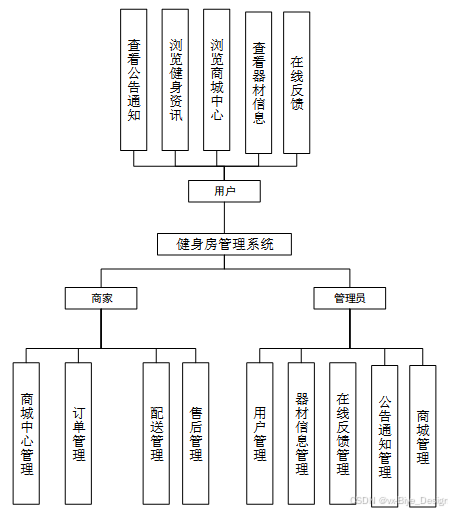 系统功能涵盖用户、商家和管理员三个角色。用户可查看公告通知、浏览健身资讯、商城中心、器材信息,并进行在线反馈。商家负责商城中心管理、订单管理、配送管理及售后管理。管理员则承担用户管理、器材信息管理、在线反馈管理、公告通知管理以及商城管理等职责。