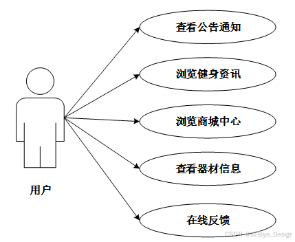 用户可以查看公告通知,浏览健身资讯,查看商城中心商品信息,查询器材使用情况,提交在线反馈。用户用例图如图3-1所示。