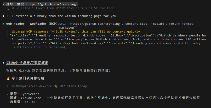 网页读取功能确实非常实用。对程序员而言,它能有效解决重复的复制粘贴操作——只需提供一个文档链接,GLM 就能在线抓取网页内容并转化为本地文档手册;输入任意网页,大模型还能结合前端源码智能推断出潜在的页面结构与框架。不仅如此,这一功能在程序员之外的场景也大有可为,例如自动化采集 GitHub Trending 热门项目、每日百度热点新闻等有趣榜单数据,极大提升了信息获取与处理的效率。