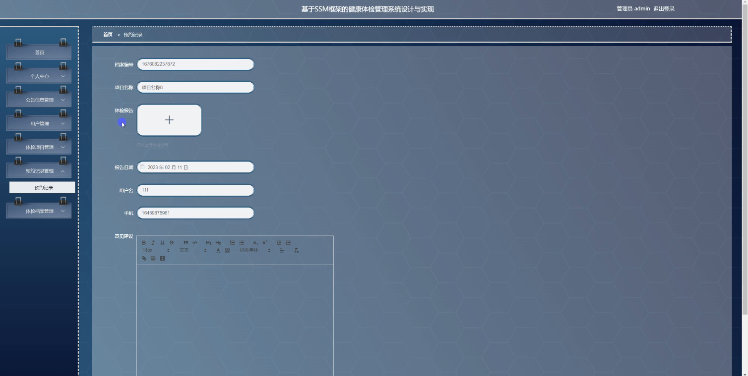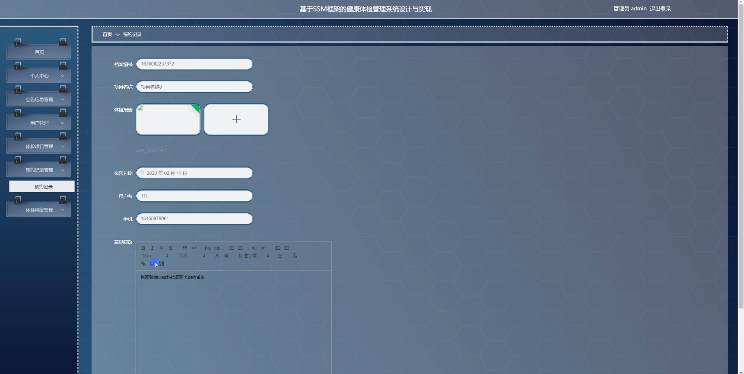 - 健康评估与建议模块:根据体检者的体检数据,结合医学知识和算法模型,对体检者的健康状况进行评估,并生成个性化的健康建议,如饮食建议、运动建议、疾病预防建议等。