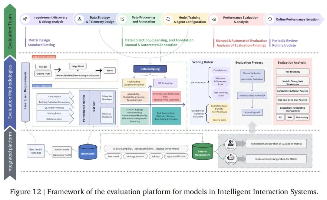 评价不仅是针对于最终的效果好坏,还贯穿在模型训练更新的全过程。文章建立了一个完整的框架,支持端到端的人工和自动评估工作流。如下图所示。(这张图本质上就值得用一篇文章来讲了,内部能讲的挺多,但论文讲的不算多,我后面再找个机会展开说一下吧,我们先跟着论文继续读下去)