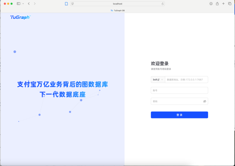 输入数据库地址:127.0.0.1:7687,默认用户名:admin,默认密码:73@TuGraph