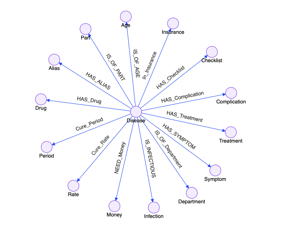 定义 13 类边(关系):HAS_ALIAS(疾病 - 别名)、HAS_SYMPTOM(疾病 - 症状)等,明确边的连接约束(如 Disease→Symptom)。