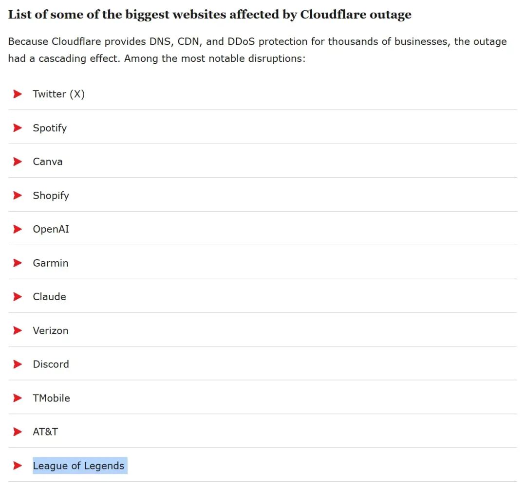 媒体统计,一度受到影响的包括:X、ChatGPT、Claude、Spotify、Shopify、英雄联盟、各类电商和公共交通网站等,范围非常广。