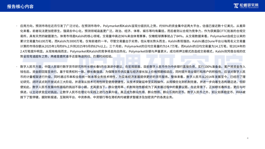 应用方向,预测市场在近月引发了广泛讨论。在预测市场中,Polymarket和Kalshi呈现分庭抗礼之势,约90%的资金集中这两大平台,估值已接近数十亿美元。从差异化来看,前者玩法更加密原生,强调去中心化,预测领域涵盖更广泛,政治、经济、体育、娱乐等均有囊括,而后者则以合规为竞争力,作为获美国CFTC批准的合规交易所,具有天然的破圈潜力。体育市场是Kalshi的核心领域,交易量中高达96%来自体育赛事,仅橄榄球赛事就占了84%。从交易数据来看,Polymarket自成立以来的累计交易量为6100万笔,而Kalshi为3000万笔,仅有前者的一半。尽管交易量出于劣势,但从增长势头而言,Kalshi表现强劲。Kalshi通过Dune平台以每周名义交易量计算的市场份额从2025年1月的8%上升到2025年9月的62%以上。三个月前,Polymarket的日均交易量约为14.7万笔,而Kalshi的日均交易量为14.2万笔,较2024年的2.4万笔提升明显。从现有格局而言,Polymarket和Kalshi的竞争将走向白热化,Polymarket份额与声量更大,成功将押注模式改造成交易模式,Kalshi则凭借合规的优势呈现弯道超车之势,两者是鹿死谁手还是殊途同归,仍需时间检验。