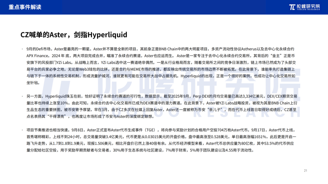 9月是加密市场传统的低迷月份,今年,似乎也无意外。从市场走势而言,9月价格表现平平,主流货币多呈波段震荡,比特币10.5万-11.7万区间支撑稳健,ETH则在3800-4700美元内波动。从宏观市场来看,美联储在9个月后再度开启降息周期,市场却因消息落地不升反降,叠加日渐增长的衰退预期,市场仍然呈现出防御态势,上涨动力不足,直到10月才在降息、政府关门等多重因素作用下实现增长,但值得警惕的是,这一上涨有提前对宽松周期乐观定价的成分。从行业热点而言,CZ鼎立站台的Aster成功催生市场对PreDEX的关注,但Aster自身的局限性使其目前更多以话题性而非实用性引发瞩目。从国内来看,由于政策原因,此前大火的RWA、稳定币均有所降温。