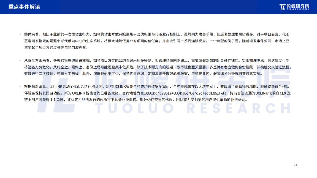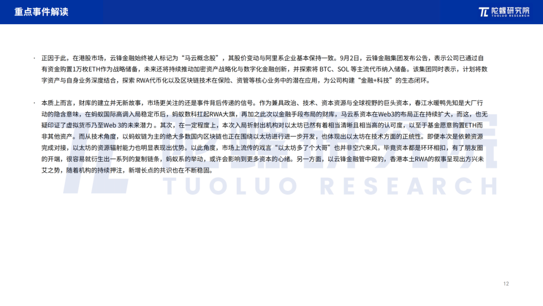 数字人民币方面,中国人民银行数字货币研究所所长穆长春9月在演讲中建议,在宏观层面,目前数字人民币作为中央银行直接负债,实行100%准备金。客户将资金存入钱包后,资金即回笼至央行。基于现责权利一致,穆长春强调,为保障货币供应量与经济增长加上价格预期相适应,同时提升商业银行和用户的积极性,应该对数字人民币的计量框架进行升级,同时通过币串和全局统一账本等业务技术特性,为实体经济发展提供更好的货币服务。整体来看,数字人民币从2014年发展至今,已经历了理论研究、闭环试点到开放试点三大阶段,并逐渐从技术可用性转至使用便捷性,从技术突破延申至实践操作,从规模优化到机制完善,并进一步向着生态构建迈进,但即便如此,数字人民币发展中所面临的挑战不容小觑,尤其是当下,群众使用率、机制有效性都成为了其发展过程中的重要议题。在此背景下,正如穆长春所言,更应与时俱进,以主动求变应对挑战,让数字人民币在理论与实践上进行改革升级,真正成为群众所用、群众想用、群众乐用的货币。数字人民币之外,如火如荼稳定币、RWA被按下了暂停键,据财新报道,互联网平台、中资券商、中资银行等在港机构均被要求暂缓涉及加密资产的各类业务。