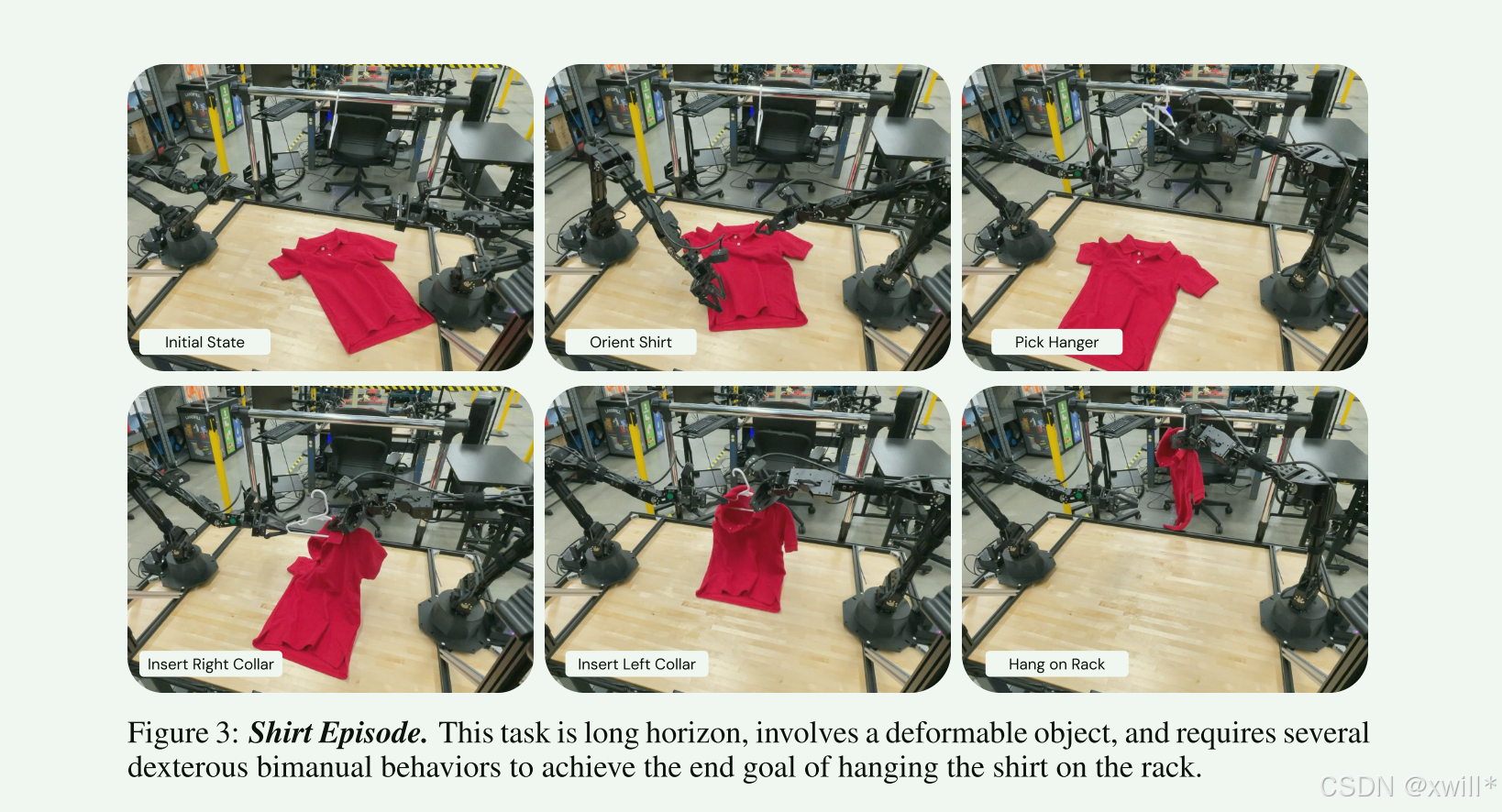 收集了五个任务:Shirt hanging(挂衬衫)、Shoelace tying(系鞋带)、Robot finger replacement(更换机器人手指)、Gear insertion(齿轮插入)、Random kitchen stack(随机厨房物品堆叠)。
