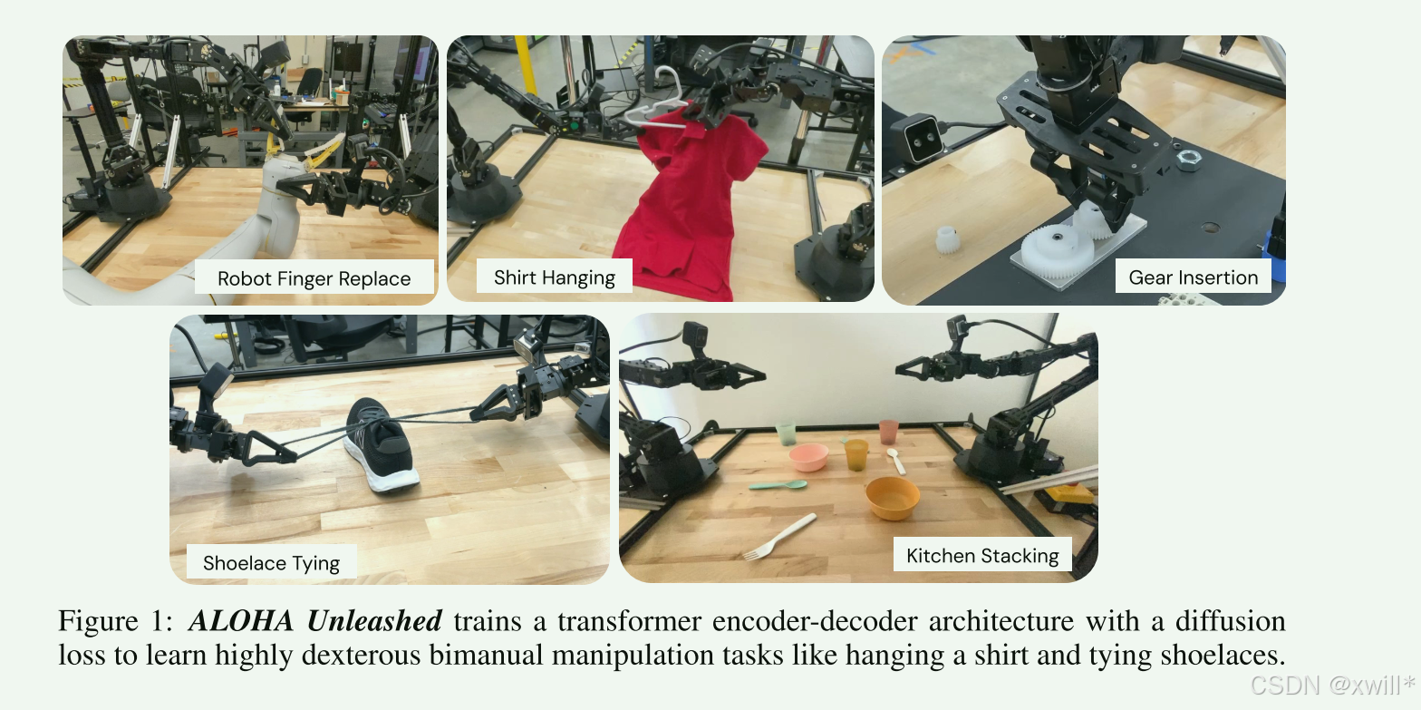 本文展示了一个简单但有效的方案,在 ALOHA 2 平台上进行大规模数据采集,并结合具有强表达能力的模型(如 扩散策略 Diffusion Policies),即可有效学习困难的双臂操作任务,包括可变形物体(如系鞋带这个任务)以及复杂接触动力学。