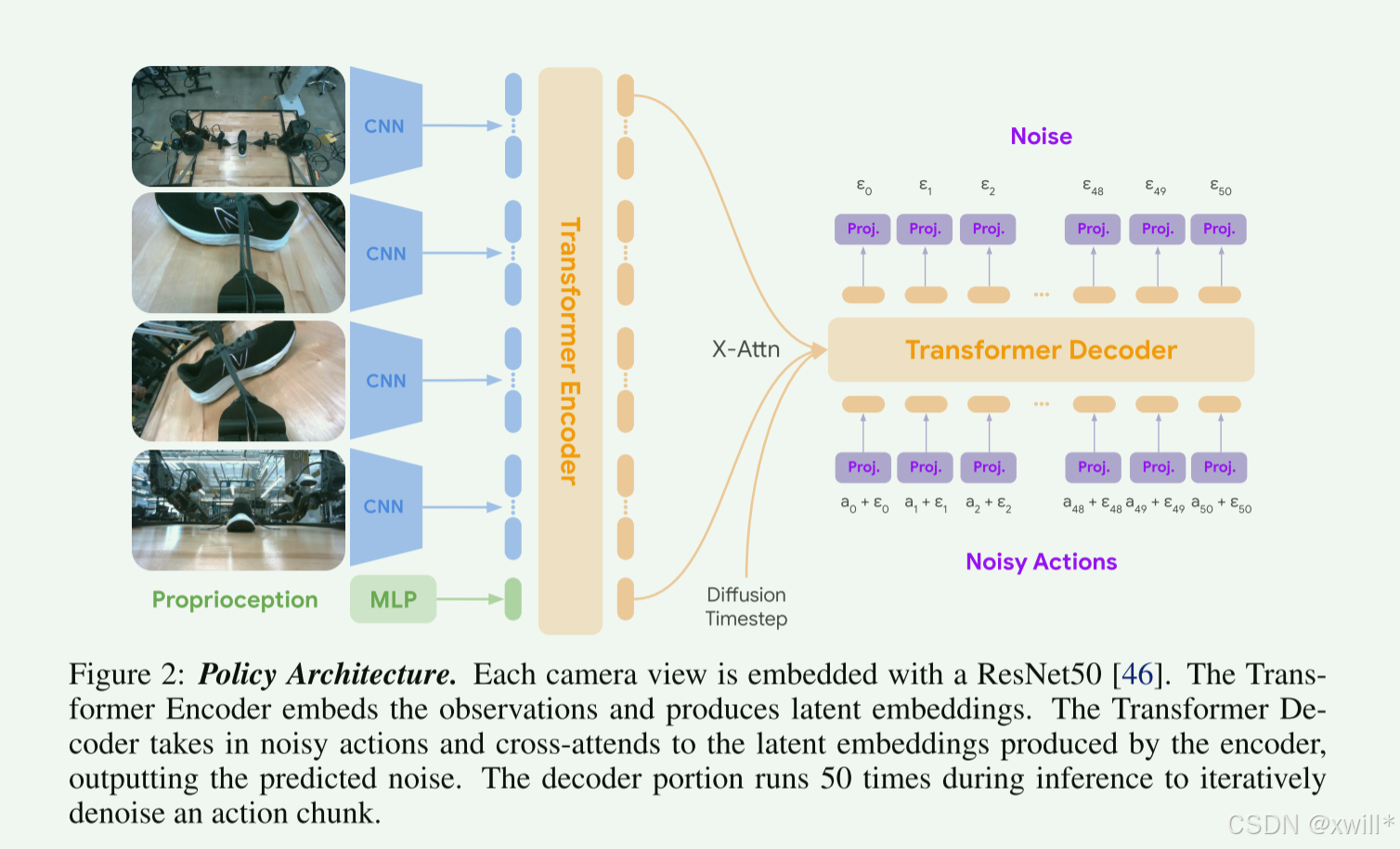其输出是(50, 512) 也就是每个动作步的 latent embedding,然后通过 线性层映射 回 (50, 14)。整个Decoder也就是把带噪声的动作 → 参考观察信息 → 去噪成合理动作。
